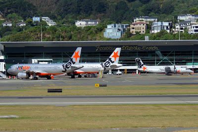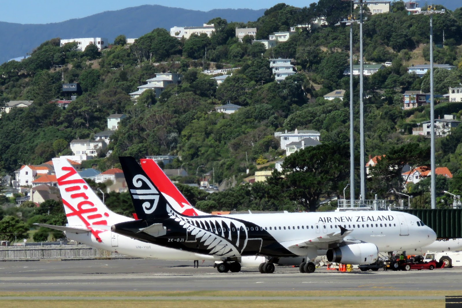 Long shots across the runway and apron can result in a bit of heat haze, but nevertheless here are Virgin Australia Boeing 737-800 VH-YIH, Qantas Boeing 737-800 ZK-ZQF and Air New Zealand A 320 ZK-OJI at the international terminal.
